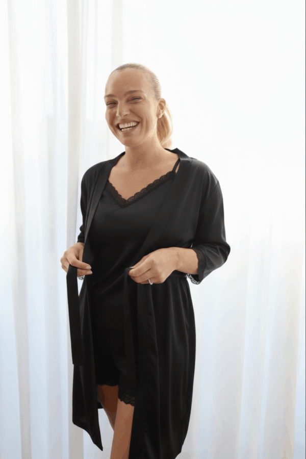 חלוק סאטן אלגנטי ומפנק, עשוי מבד סאטן חלק ויוקרתי שמעניק מגע חלק ונעים על הגוף.עם חגורת קשירה