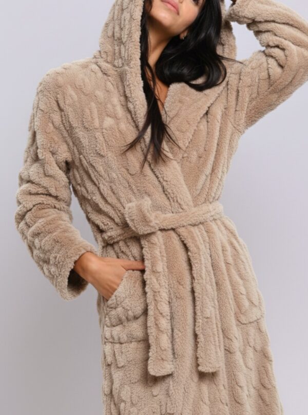 החלוק כולל כיסים קדמיים נוחים חגורת קשירה וכובע