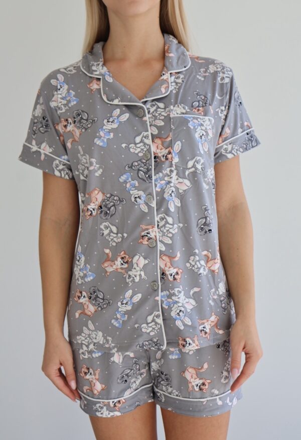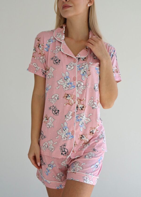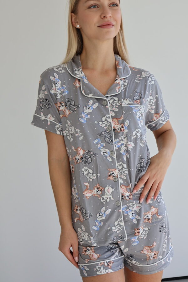 הסט כולל חולצה עם שרוול קצר וצווארון עם כפתורים, יחד עם מכנסיים קצרים בעלי גומי במותן ושרוך להתאמה נוחה ומדויקת.