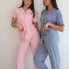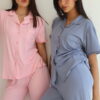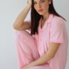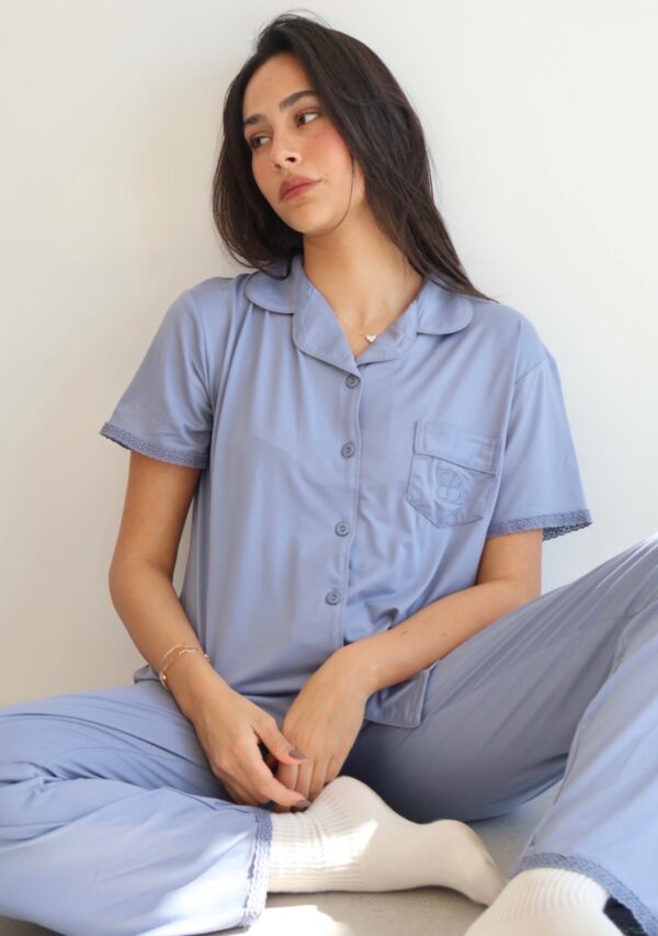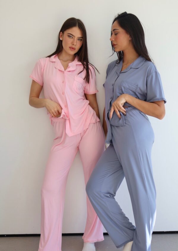 בד נשפך ורך במיוחד. סט מכופתרת קצרה ומכנס ארוך עם גימורים.